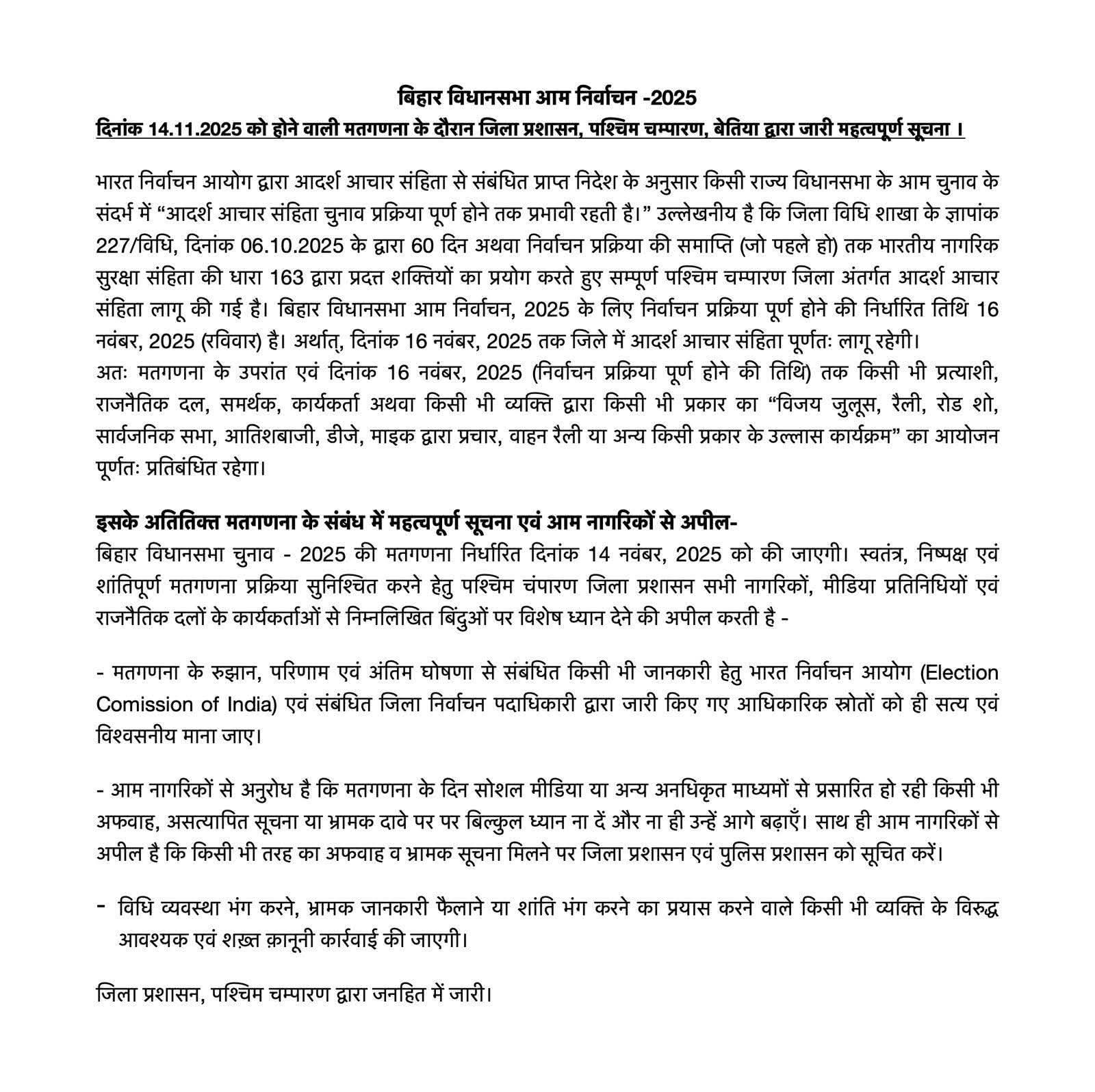 बिहार विधानसभा आम निर्वाचन–2025 के संदर्भ में 14 नवंबर 2025 को होने वाली मतगणना को लेकर पश्चिम चम्पारण, बेतिया जिला प्रशासन ने महत्वपूर्ण दिशा-निर्देश जारी किए हैं। भारत निर्वाचन आयोग के निर्देशानुसार किसी भी राज्य के विधानसभा आम चुनाव की निर्वाचन प्रक्रिया पूर्ण होने तक आदर्श आचार संहिता प्रभावी रहती है।जिला विधि शाखा के ज्ञापांक 227/विधि, दिनांक 06.10.2025 के अनुसार संपूर्ण पश्चिम चम्पारण जिले में भारतीय नागरिक सुरक्षा संहिता की धारा 163 के अंतर्गत 60 दिनों हेतु अथवा निर्वाचन प्रक्रिया समाप्ति (जो पहले हो) तक आदर्श आचार संहिता प्रभावी की गई है।बिहार विधानसभा चुनाव–2025 की निर्वाचन प्रक्रिया 16 नवंबर 2025 (रविवार) को पूर्ण मानी जाएगी। अतः 16 नवंबर 2025 तक जिले में आदर्श आचार संहिता पूर्णतः लागू रहेगी।